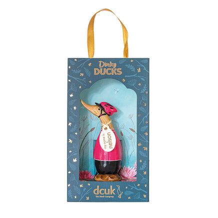 Dinky Duck from DCUK with their Cycling Outfit and Hat and is ready to turn their Cycle Wheels! Made from Natural Bamboo Root - Approximately 10cm Tall with a randomly selected Name Tag. Please note that due to the method of production, size may vary slightly and pose of duck may be different to image shown.