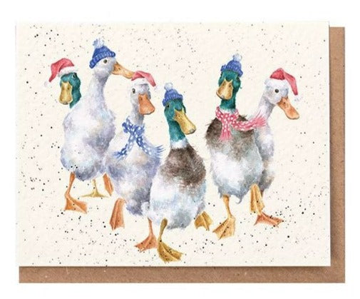 This miniature card features six ducks in festive hats 'All Wrapped Up' design. The card measures 91mm x 72mm. Each card is printed on textured, sustainably sourced board and is supplied with a recycled kraft envelope. 13p from the sale of every card in this range of festive charity cards will go to the Marine Conservation Society, the UK charity working for seas full of life.